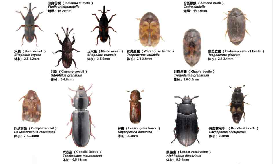 仓储害虫(Stored Product Insects)包括多种甲虫、飞蛾以及螨虫,它们能够侵入整个谷粒,或是食物加工成品。这些害虫能够危害多种食物,如面粉、谷物、宠物粮和干果。最常见的仓储害虫有飞行及爬虫两种。